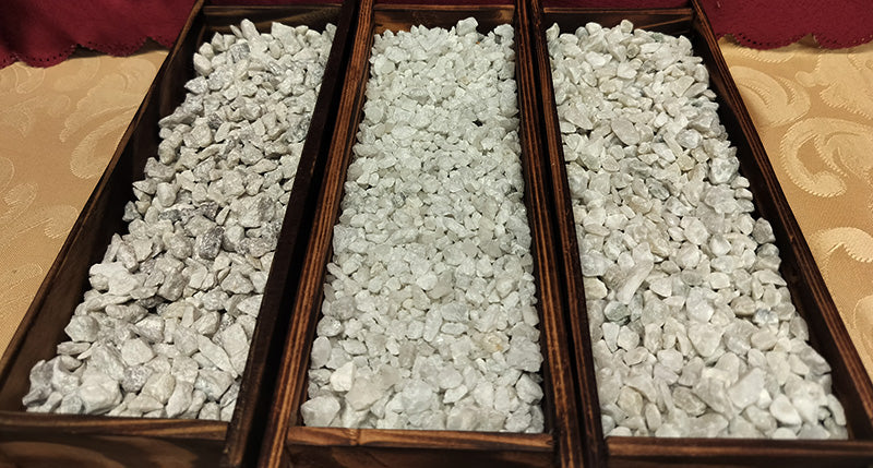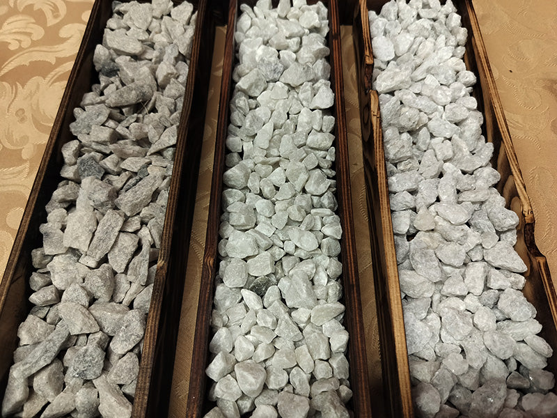 Här får kunden alla tre stensorter, men i samma fraktion — Fine, Medium eller Large — vilket skapar ett vackert systematiskt uttryck som framhäver skillnaderna i färg, känsla och karaktär.